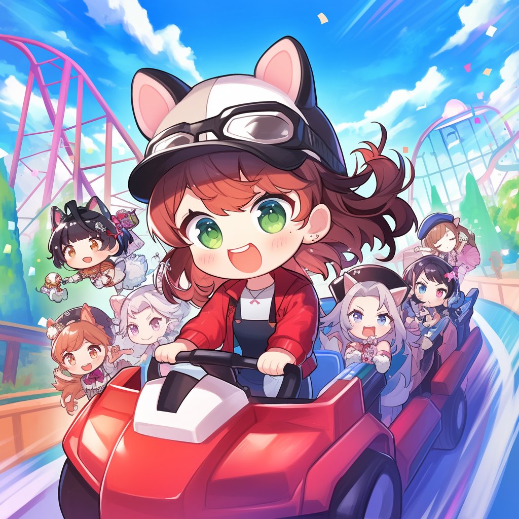 Chibi celebrities running a theme park for a day, ride operations, mascot duties, souvenir signing, VIP tour guiding --niji 6