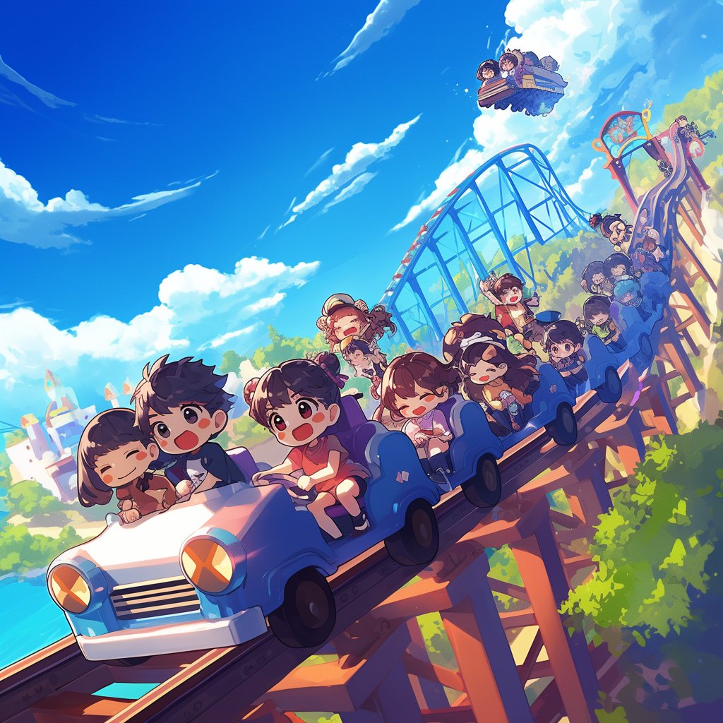 Chibi celebrities running a theme park for a day, ride operations, mascot duties, souvenir signing, VIP tour guiding --niji 6